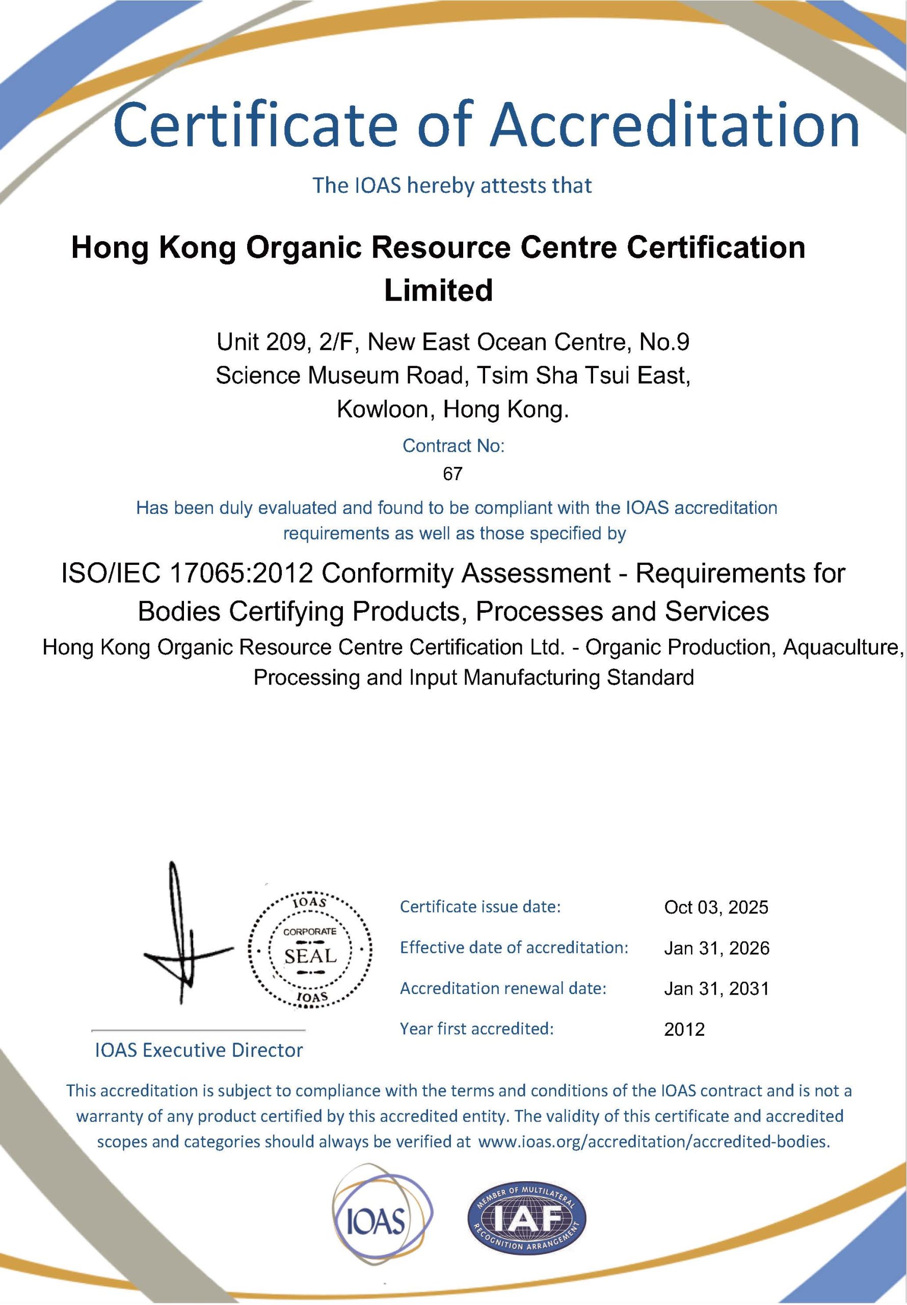 本公司獲IOAS (International Organic Accreditation Service)認可,認可範圍為作物生產、水產養殖及加工處理認證,登記編號︰67。如欲查閱IOAS認可機構最新名單,請瀏覽以下網址︰